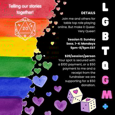 Using Indy RPGs, I host games for Queers in Baltimore and online. With you, we'll tell our stories together!